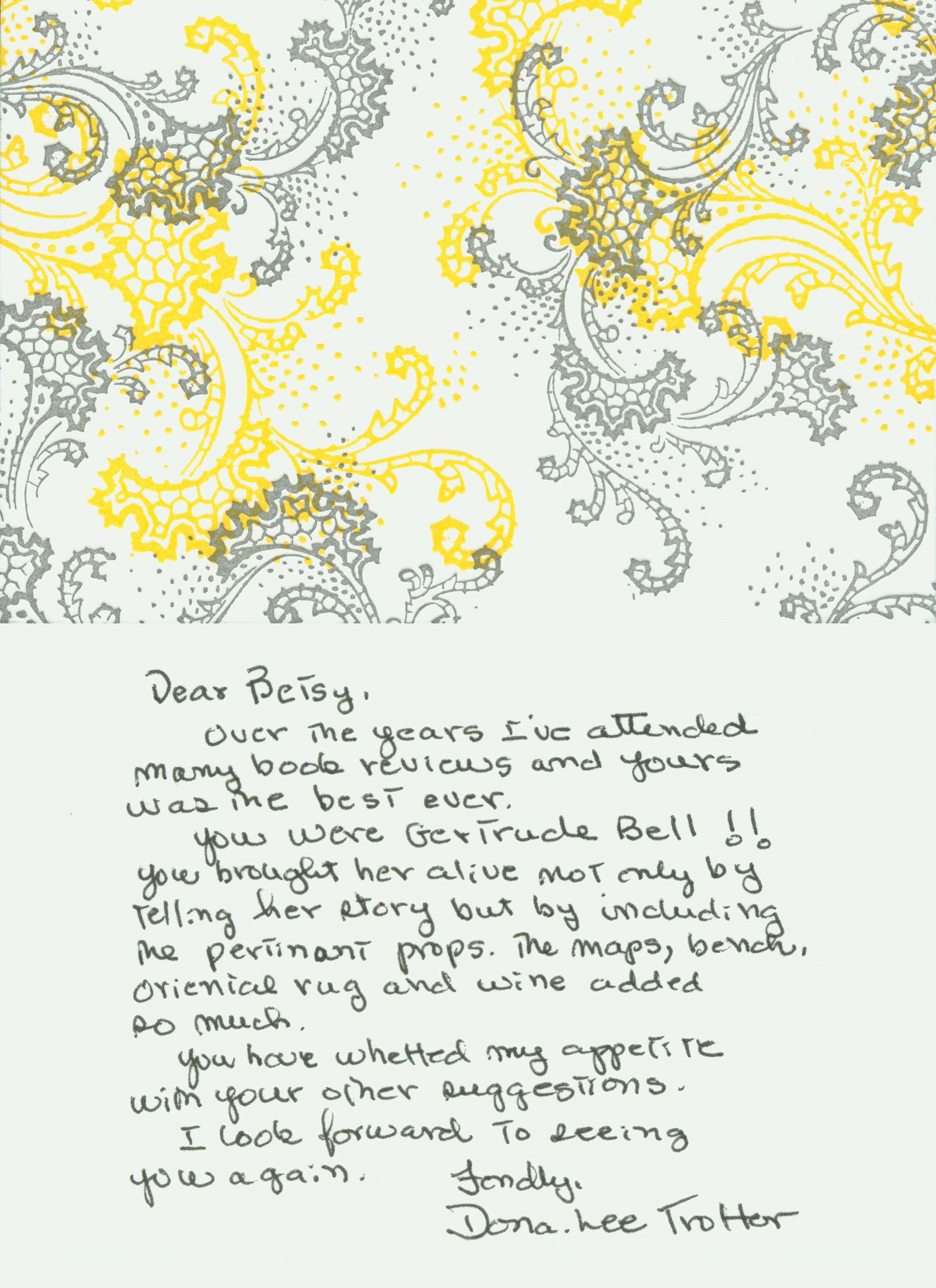 Over the years I've attended many book reviews and yours was the best ever. You were Gertrude Bell!! You brought her alive...