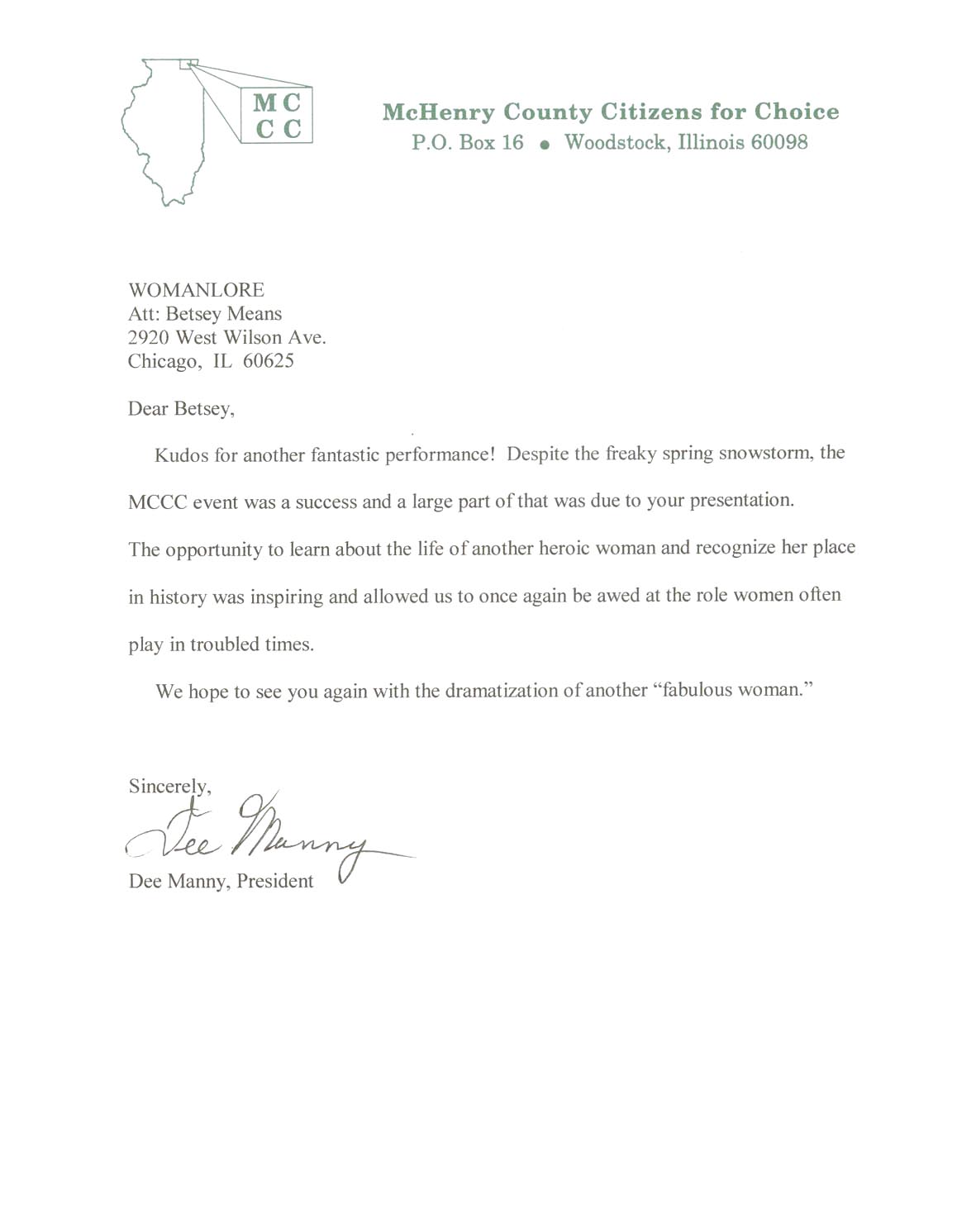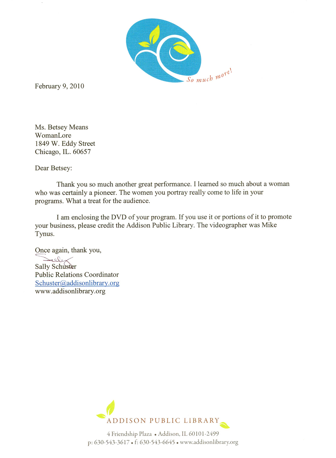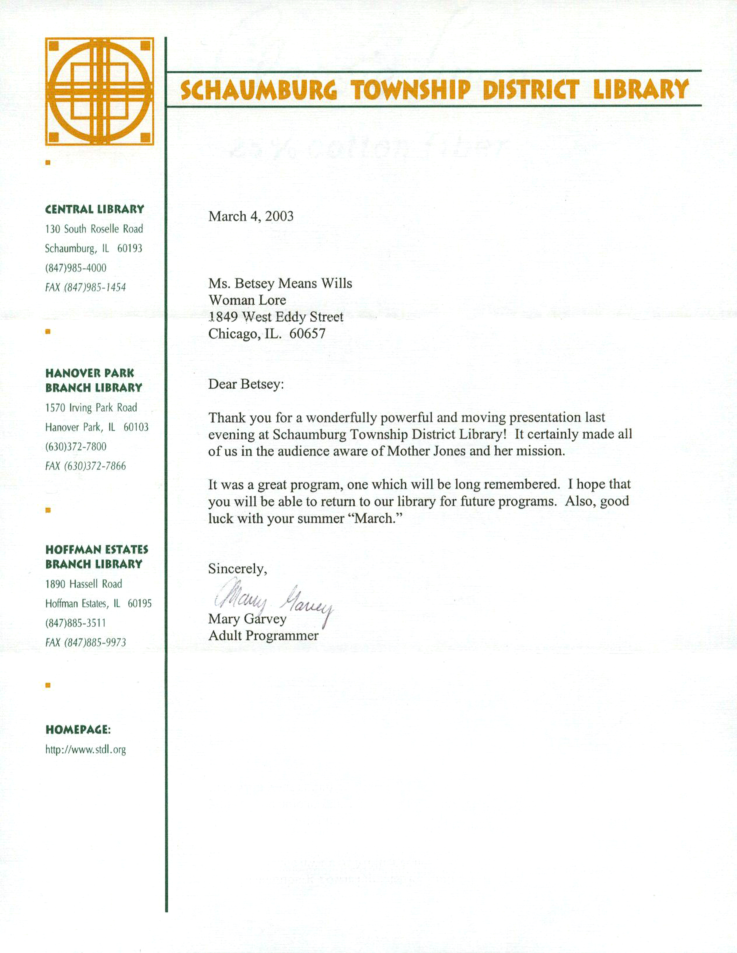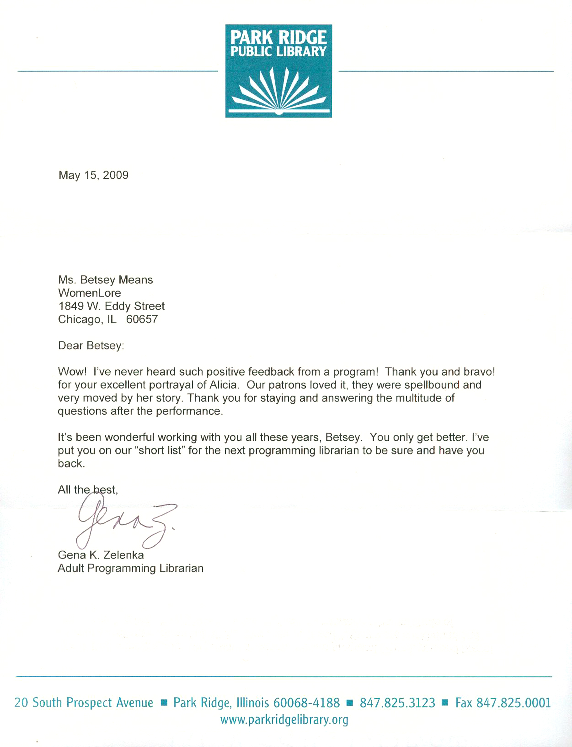 I would recommend this program (Mother Jones) to any college or university interested in Women's Studies, History, Labor History, and Cultural Studies. You are a marvelous performer and a generous spirit.